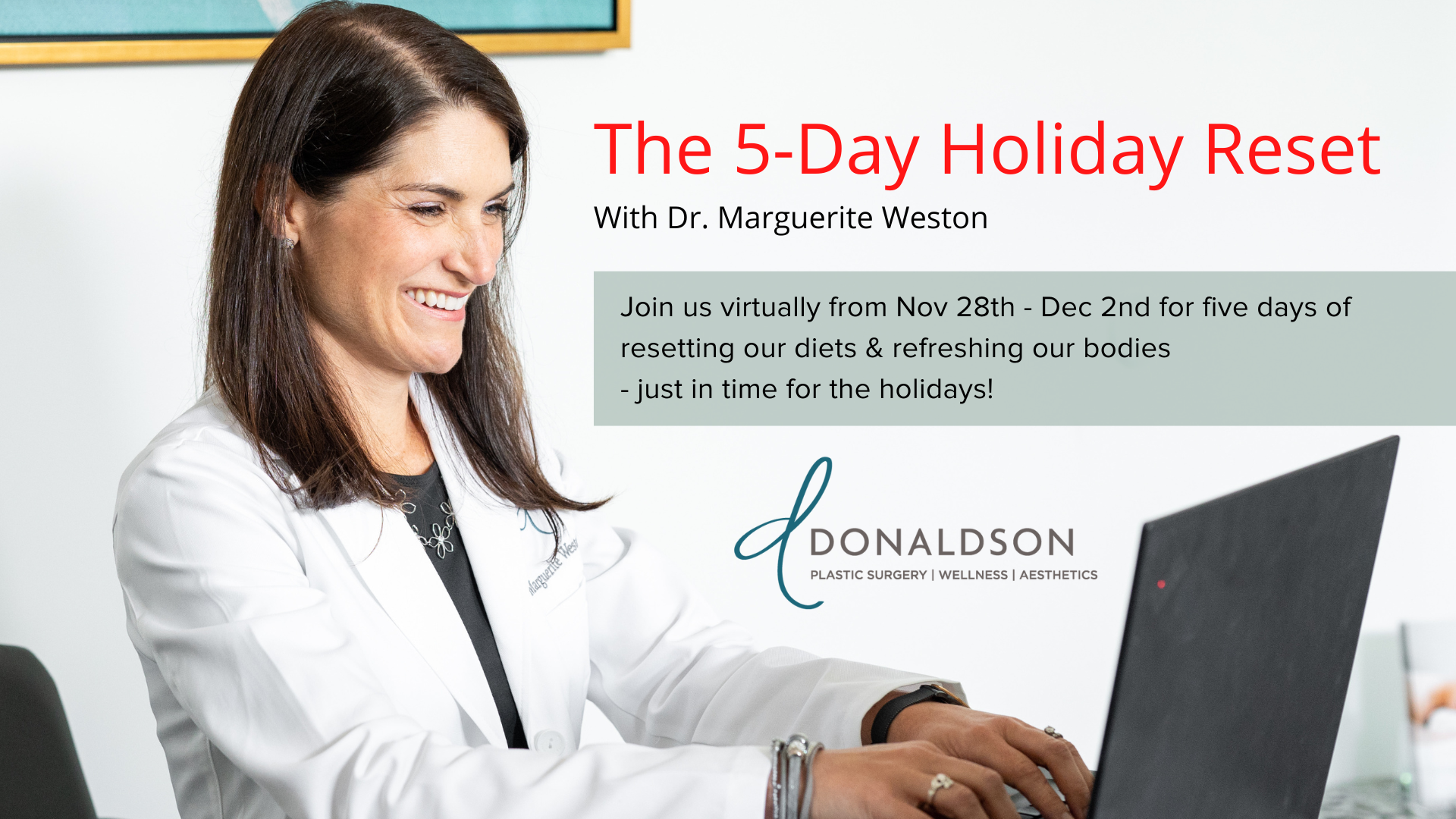 You’re officially invited to join us virtually from Monday, Nov. 28 until Friday, Dec. 2 for 5 days of mindfulness and wellness. Functional Medicine expert Dr. Marguerite Weston, Nurse Practitioner Angie Scala, Medical Aesthetician Nikki Rucinsky and our friends at Rise Chiropractic & Nutrition are coming together to deliver a steady stream of healthy living insights that you can actually use in your normal routine – right when we all need it most!