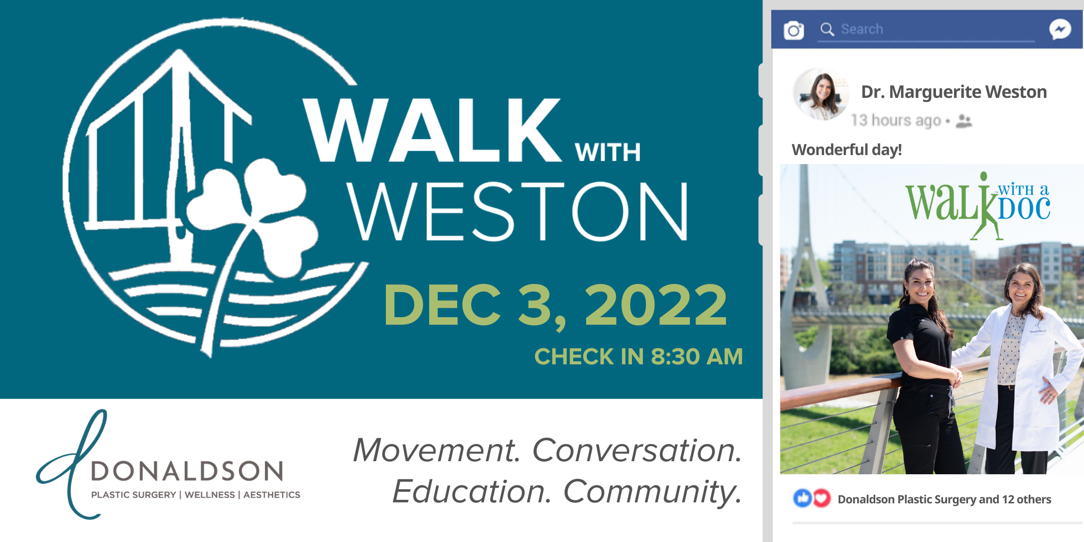 Donaldson Plastic Surgery’s very own functional medicine expert Dr. Marguerite Weston will lead the pack as we embark on our first-ever Walk With A Doc meet-up! This monthly event combines active movement, insightful education and thoughtful conversation to engage our beloved local community in a new, wellness-minded manner.
