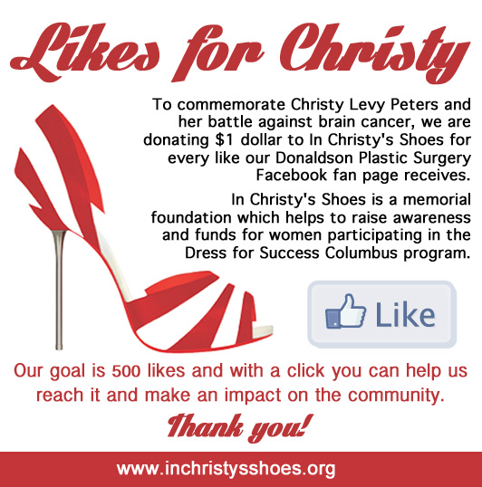 To commemorate Christy Levy Peters and her battle against brain cancer, we are donating $1 dollar to In Christy’s Shoes for every like on our Donaldson Plastic Surgery Facebook fan page receives.